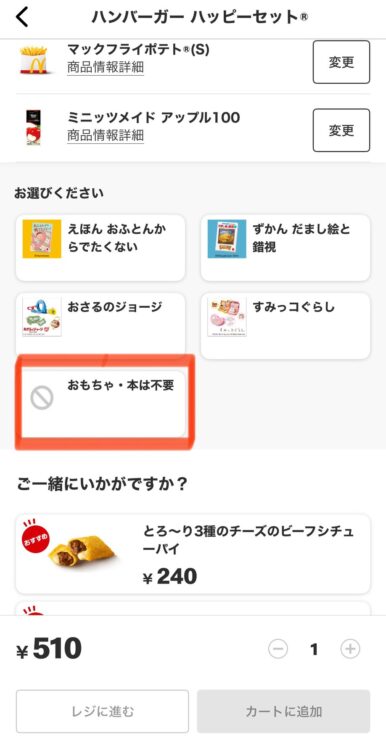 モバイルオーダーではおもちゃなしがあらかじめ選択できるようになっているので、気軽に注文しやすいですよね。